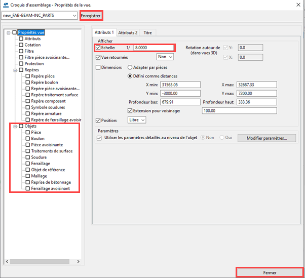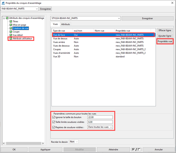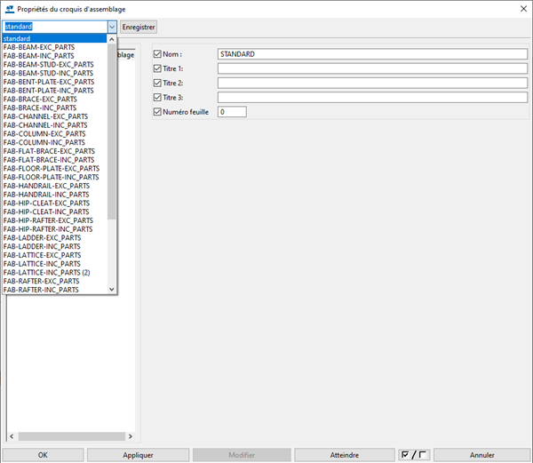 Voici un exemple d’une liste de paramètres de dessin dans un plan d'ensemble :