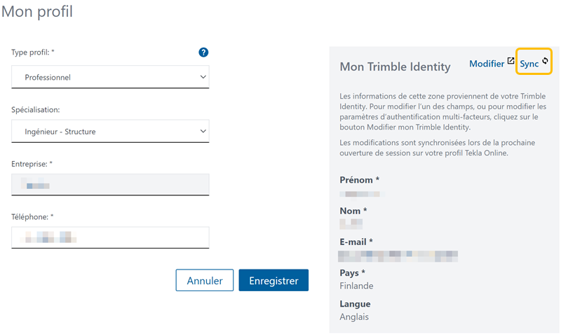 Les modifications apportées à votre Trimble Identity sont automatiquement synchronisées dans votre Online Profile lorsque vous vous connectez. Si vous avez apporté des modifications à votre Trimble Identity après vous être connecté à votre Online Profile, vous pouvez synchroniser manuellement les modifications.
