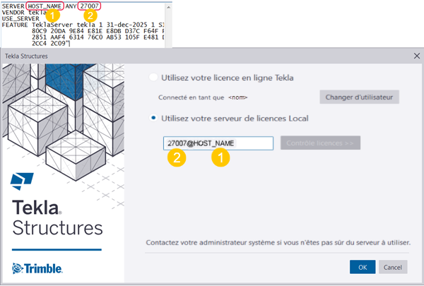 Si le serveur de licences local est installé sur un ordinateur différent de Tekla Structures, connectez Tekla Structures au serveur de licences local lorsque vous démarrez Tekla Structures pour la première fois.