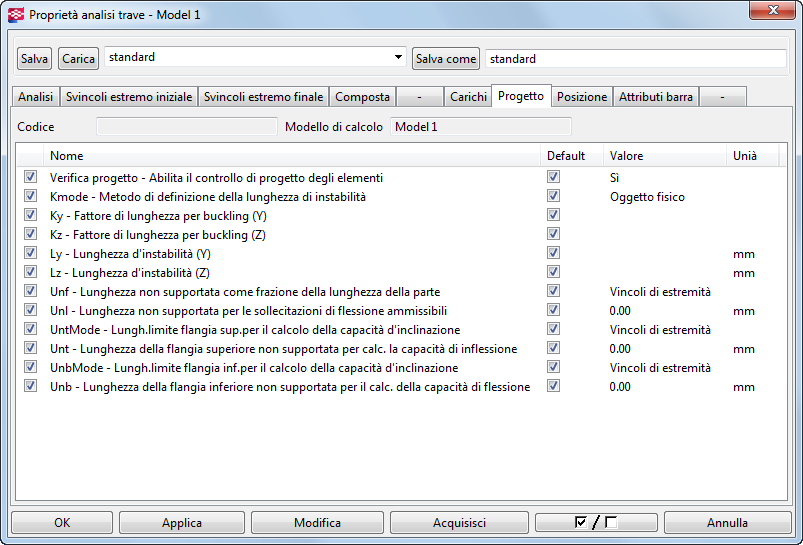 Le proprietà visualizzate quando si apre la scheda Progetto per la prima volta in una finestra di dialogo delle proprietà delle parti di analisi sono le proprietà applicate all'intero modello di calcolo selezionato nella finestra di dialogo Modelli di Calcolo e Progetto.