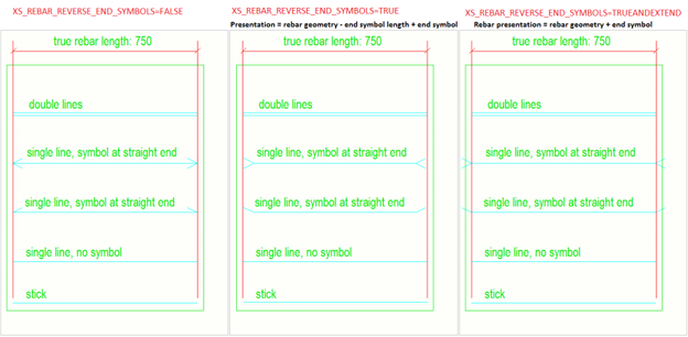 Utilizzare per indirizzare i simboli di fine delle barre d'armatura in una direzione diversa. Se questa opzione avanzata è impostata su TRUE, il simbolo di fine è disegnato a un angolo di 135 gradi (utilizzato comunemente in Norvegia). Se si utilizza la visualizzazione linea singola e nessun simbolo sulla estremità diritta, utilizzare il valore TRUEANDEXTEND. Se si utilizza TRUE per questi tipi di barre d'armatura, saranno disegnati troppo brevi. Il valore di default è FALSE.