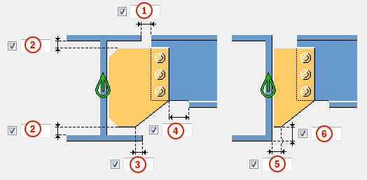 Utilizzare la scantonatura manuale quando una parte che non appartiene alla connessione entra in collisione con la trave secondaria. Quando si utilizza la scantonatura manuale, la connessione crea tagli utilizzando i valori inseriti nei campi della scheda Intaglio. È possibile utilizzare valori diversi per la flangia superiore e inferiore.