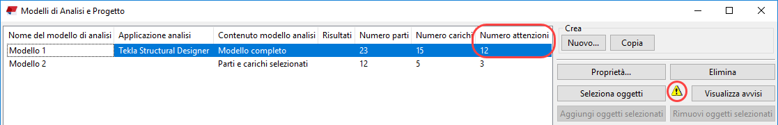 In caso di problemi durante la creazione di un modello di analisi, Tekla Structures mostra un avviso nella finestra di dialogo Modelli di Analisi e Progetto quando si seleziona il modello di analisi.