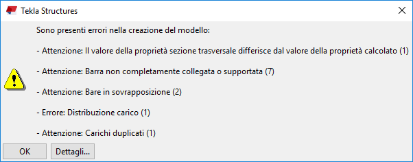 Tekla Structures visualizza una finestra di dialogo degli avvisi in cui sono elencati i tipi di problemi che si sono verificati durante la creazione del modello di analisi. Ad esempio: