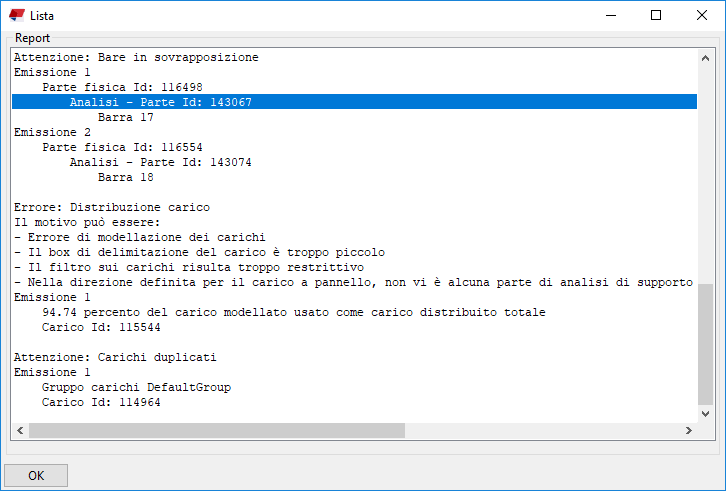 Tekla Structures visualizza una lista dettagliata degli avvisi e degli errori. Ad esempio: