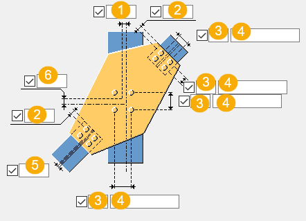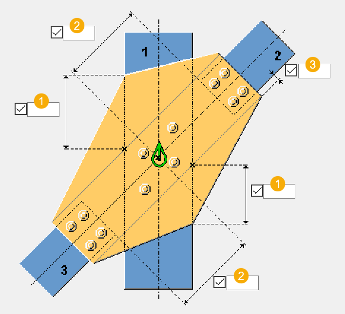 Spessore, larghezza e altezza del piatto distanziatore. Se il profilo della parte principale è superiore al profilo delle parti diagonali, è possibile creare piatti distanziatori tra il piatto di connessione e le parti diagonali per riempire lo spazio vuoto. A tale scopo, le parti diagonali devono essere collegate centralmente alla parte principale. Di default, lo spessore del piatto è uguale alla larghezza della distanza tra il piatto di connessione e la trave secondaria. Se lo spessore è definito, il componente crea tutti i piatti che possono essere adattati nella distanza. |