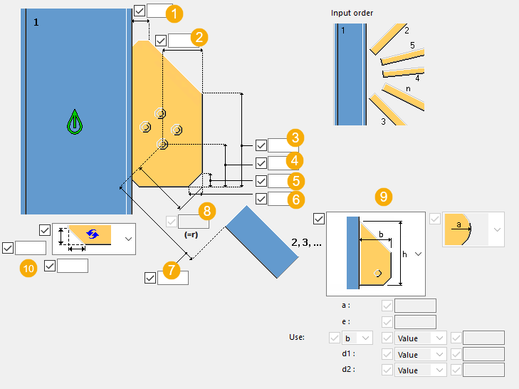 | 1 | Definisce l'entità della sovrapposizione del piatto piastra alla flangia della parte principale. Se non si immette alcun valore, il piatto piastra raggiunge l'anima della parte principale. |
