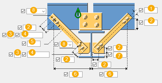 Definire la distanza tra i bulloni e i fori per i bulloni che collegano i puntelli o i puntelli travetto agli arcarecci. |