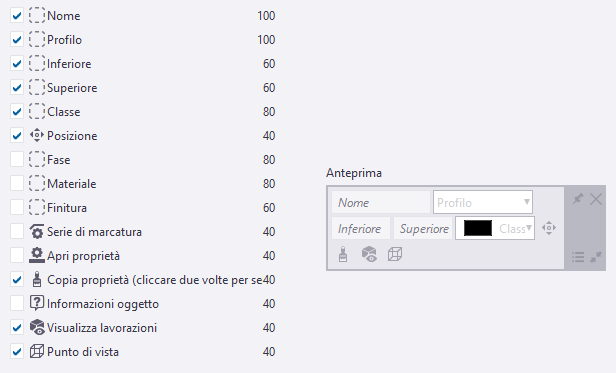 Utilizzare la barra degli strumenti contestuale per visualizzare e modificare rapidamente le proprietà di base di un modello o un oggetto di disegno, una vista, una griglia e così via. È possibile personalizzare la barra degli strumenti contestuale selezionando quali elementi della barra degli strumenti sono visibili. È inoltre possibile regolare la larghezza degli elementi e aggiungere icone e titoli aggiuntivi agli elementi.