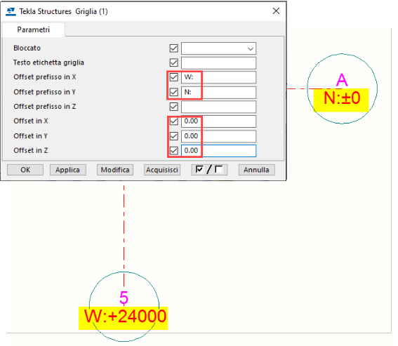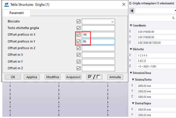 Prima di poter personalizzare le etichette griglia, è necessario modificare le proprietà della griglia definite dall'utente nel modello, nonché le altre proprietà della griglia, in base alle proprie esigenze. È inoltre possibile scegliere di modificare il testo prefisso nel disegno.