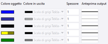 Per impostazione predefinita, la Colore oggetto colonna mostra l'insieme configurato di colori degli oggetti del disegno. Utilizzare le opzioni Colore in uscita per definire i colori da utilizzare nell'output e la colonna Spessore per definire gli spessori delle linee. La colonna Anteprima output mostra un'anteprima delle linee stampate.