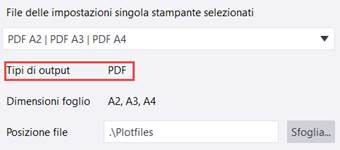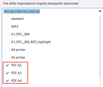 Quando si stampa un insieme di disegni nella modalità stampanti multiple utilizzando i file delle impostazioni singola stampante precedenti, tutti i disegni in formato A4 generano file .pdf con prefisso A4_, tutti i disegni in formato A3 avranno il prefisso A3_ e tutti i disegni A2 genereranno file .pdf con prefisso A2_.