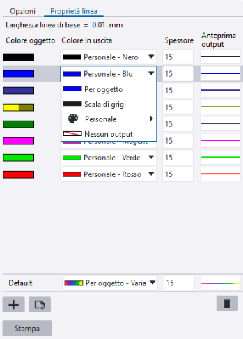 Per utilizzare un solo colore e spessore linea nella stampa per tutti gli oggetti, definire il colore e lo spessore linea desiderati per la riga Default ed eliminare tutte le righe delle proprietà linea. Se si seleziona Per oggetto, i colori oggetto del disegno vengono utilizzati nella stampa così come sono nel disegno. |