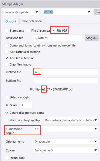- PDF A3: Formato carta impostato su A3, prefisso file impostato su A3_