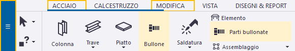 Tekla Structures evidenzia i comandi sulla ribbon o nel menu File. Ad esempio: