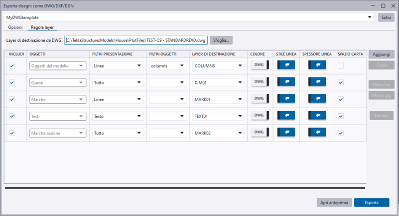 Per utilizzare questa impostazione, lo stesso disegno deve essere già stato esportato, la configurazione del layer/livello e il template devono essere uguali a come erano durante l'esportazione precedente. Tutte le linee CAD aggiunte precedentemente rimarranno nel file e solo il contenuto di Tekla Structures verrà aggiornato, a meno che la modifica non sia stata eseguita in un editor dei blocchi CAD.