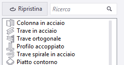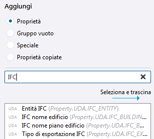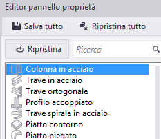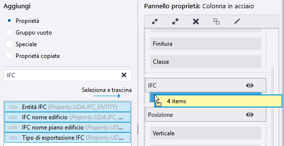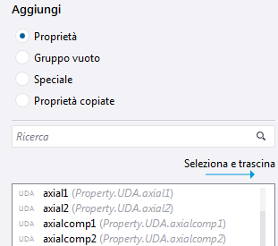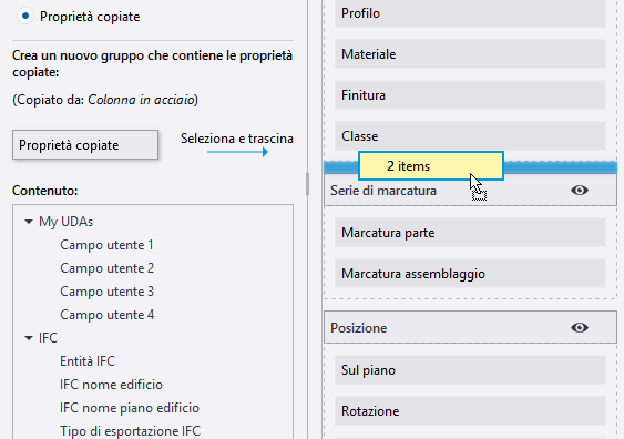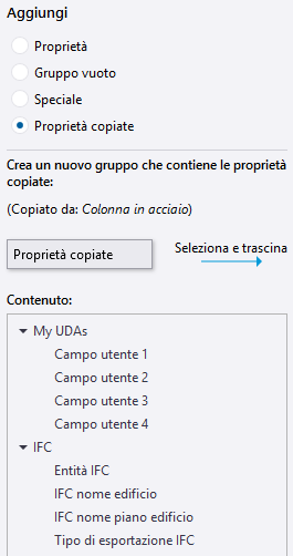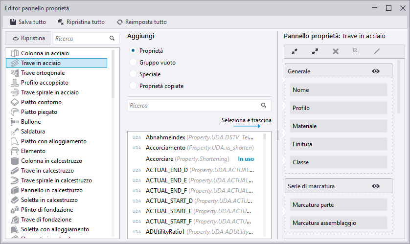 Lista di proprietà al centro. La lista mostra tutte le proprietà disponibili per ciascun oggetto del modello o oggetto del disegno. Per gli oggetti del modello vengono inoltre visualizzati gli attributi utente (UDA) per ciascun tipo di oggetto. È possibile aggiungere tali proprietà e UDA al layout del pannello proprietà come proprietà regolari. Le proprietà già in uso non possono essere aggiunte una seconda volta, ma è possibile riorganizzarle nel layout del pannello proprietà. Le proprietà non compatibili con il tipo di oggetto selezionato non possono essere aggiunte.