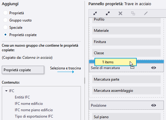 È possibile copiare le proprietà da un tipo di oggetto a un altro tipo di oggetto, ad esempio, dalla trave in acciaio al piatto in acciaio. Se necessario, è possibile copiare più gruppi di proprietà contemporaneamente.