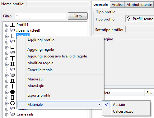 È possibile definire i profili disponibili per le parti in acciaio, le parti in calcestruzzo o entrambe. Il tipo di profilo associato influisce sui tipi di profilo visualizzati nella finestra di dialogo Seleziona profilo quando si modifica il materiale di una parte.
