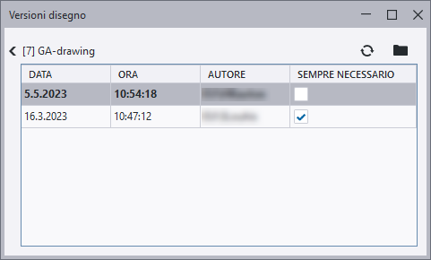 Viene aperta la finestra di dialogo Versioni disegno. Nella finestra di dialogo è possibile selezionare una versione di disegno, cliccare con il pulsante destro del mouse e aprire la versione selezionata. È possibile salvare la versione del disegno ed eseguire la scrittura per renderla la versione del disegno selezionata la versione corrente per tutti gli utenti. Per mantenere ragionevole il numero di file di disegno, utilizzare le opzioni avanzate XS_DELETE_UNNECESSARY_DG_FILES e XS_DELETE_UNNECESSARY_DG_FILES_SAFETY_PERIOD. L'opzione avanzata L'opzione avanzata Tuttavia, se si desidera proteggere alcune versioni del disegno dalla rimozione automatica, utilizzare la casella di controllo Sempre necessario nella finestra di dialogo Versioni disegno. Impostare l'opzione Sempre necessario singolarmente per ogni versione di disegno che si desidera conservare, selezionando la casella di controllo corrispondente.