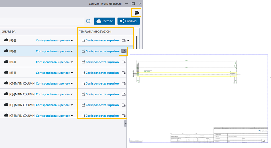 Nuova colonna per la selezione di un template o delle impostazioni: Una nuova colonna Template/Impostazioni è stata aggiunta alla finestra di dialogo che consente di selezionare un modello o il relativo file di impostazioni per la creazione del Revisione creazione disegno. Ciò offre maggiore flessibilità e controllo sul processo di creazione del disegno.