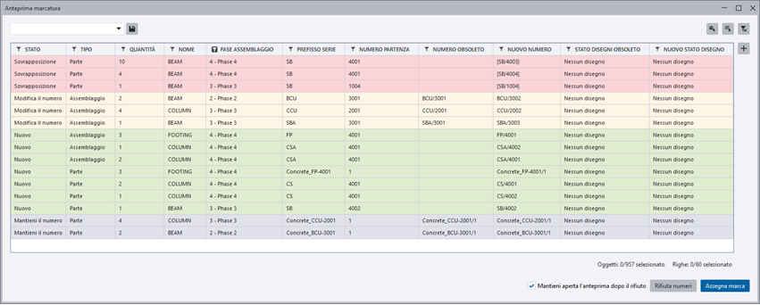 Nella finestra di dialogo Anteprima marcatura, è possibile filtrare e ordinare i risultati della marcatura in vari modi, nonché trovare gli oggetti con numeri sovrapposti che devono essere corretti. È quindi possibile accettare i numeri proposti oppure rifiutarli e tornare indietro per regolare le impostazioni di marcatura e il modello in base alle esigenze.
