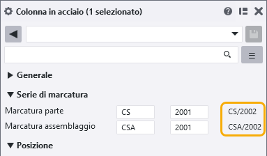 Dopo la marcatura, è ora possibile visualizzare i numeri posizione effettivi di parti, assemblaggi, unità di getto e assemblaggi di barre d'armatura selezionati nel pannello proprietà accanto al prefisso serie e numero partenza. Ad esempio:
