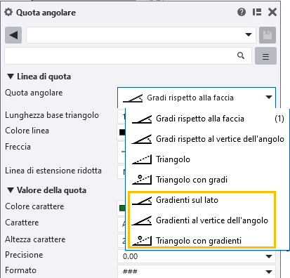 Sono disponibili nuove opzioni gradiane nel pannello delle proprietà di quota angolo, nella barra degli strumenti contestuale, nelle proprietà quota del disegno di progetto/montaggio e nelle finestre di dialogo delle proprietà quota precedenti: