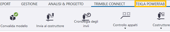 Sulla ribbon è presente una nuova scheda Tekla PowerFab contenente gli strumenti per il workflow collaborativo end-to-end. Gli strumenti aiutano il team di progetto a collaborare utilizzando le stesse informazioni.