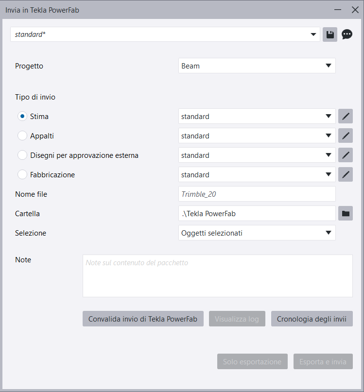 Lo strumento di invio guida l'utente durante l'esportazione e l'invio di diversi tipi di pacchetti al costruttore in qualsiasi fase del progetto. È possibile esportare i seguenti dati da Tekla Structures a livello locale per verificarli o direttamente in Tekla PowerFab per la stima, l'ordinazione dei materiali e la fabbricazione: