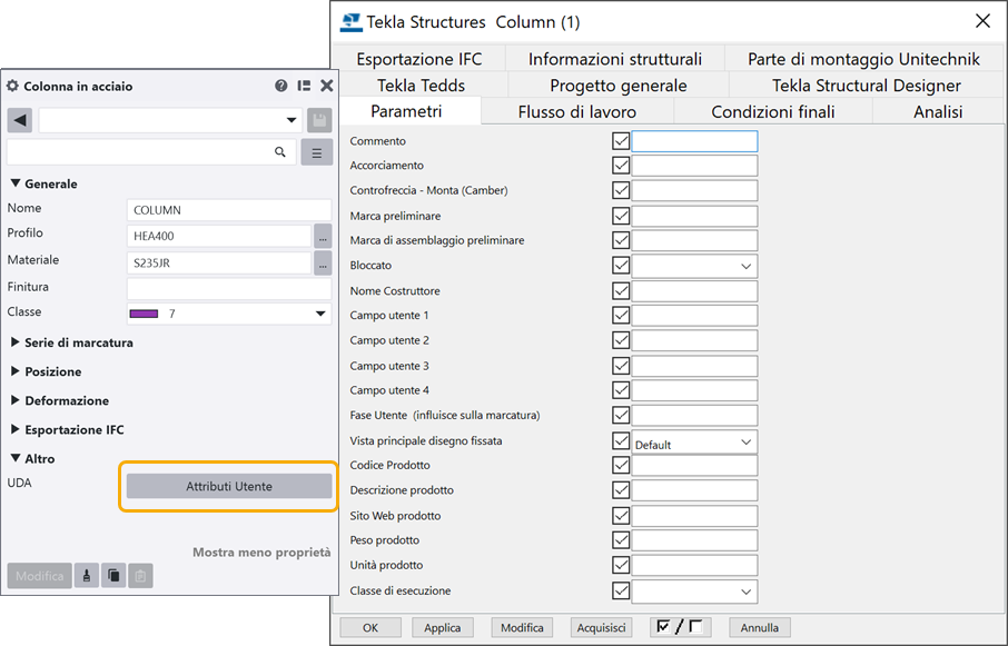 Il pannello proprietà e molte finestre di dialogo contengono UDA per vari oggetti, compresi travi, colonne, bulloni e disegni. Tekla Structures visualizza questi campi quando si clicca sul pulsante Attributi utente nel pannello proprietà o in una finestra di dialogo.