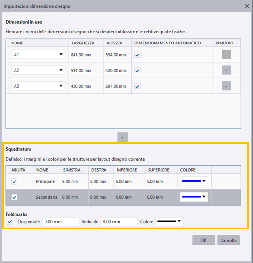 quando si definiscono i colori della squadratura disegno e delle foldmark in Editor layout disegno