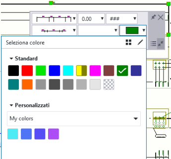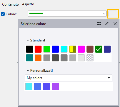 Nel pannello proprietà degli oggetti di disegno: cliccare su una casella di impostazione del colore dove è possibile selezionare i colori dalle tavolozze disponibili. Per accedere alla modalità di modifica del colore personalizzato, cliccare sul pulsante