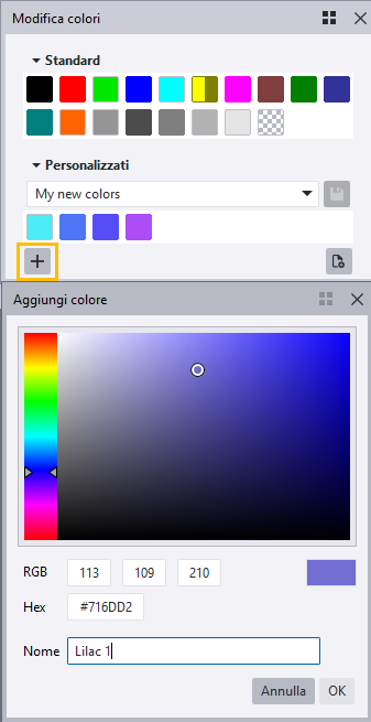 Aggiungi nuovo colore personalizzato. - Nella finestra di dialogo visualizzata Aggiungi colore , utilizzare il cursore del colore a sinistra per passare al colore desiderato, quindi selezionare la tonalità desiderata nell'area del colore con il selettore colore.