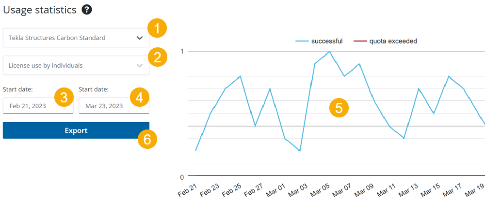 | 6 | Esporta le statistiche per la licenza selezionata come file di valori separati da virgola (CSV). L'esportazione delle statistiche consente di importare i dati in un'altra applicazione, ad esempio Microsoft Excel, per visualizzarli ed elaborarli all'esterno di Tekla Online Admin Tool. |