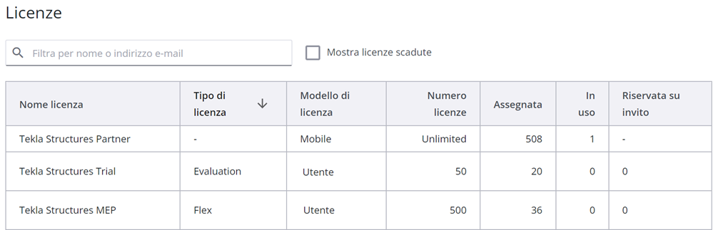 È possibile filtrare la tabella delle licenze in base al nome della licenza e al fatto che le licenze siano attualmente valide. È inoltre possibile ordinare i tabella per qualsiasi intestazione di colonna.