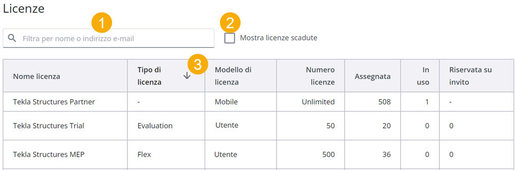 | 1 | Per filtrare in base al nome della licenza, digitare parte del nome. |