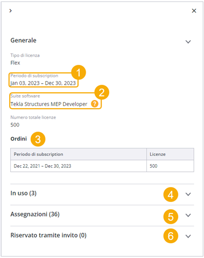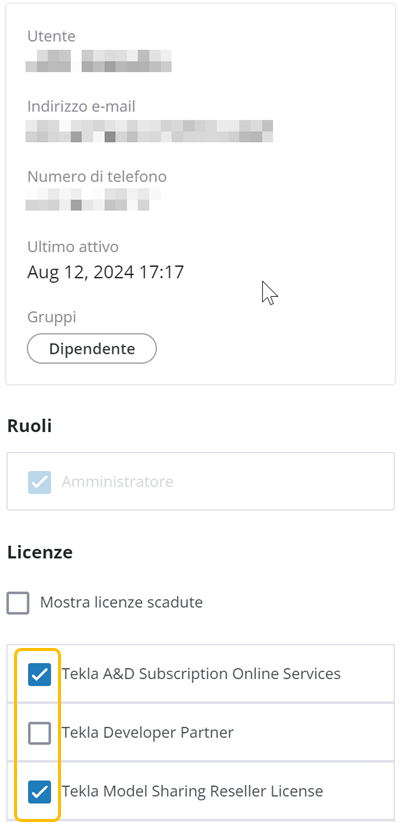 Tutti gli utenti possono visualizzare le licenze con subscription attualmente assegnate nel proprio profilo Tekla Online.