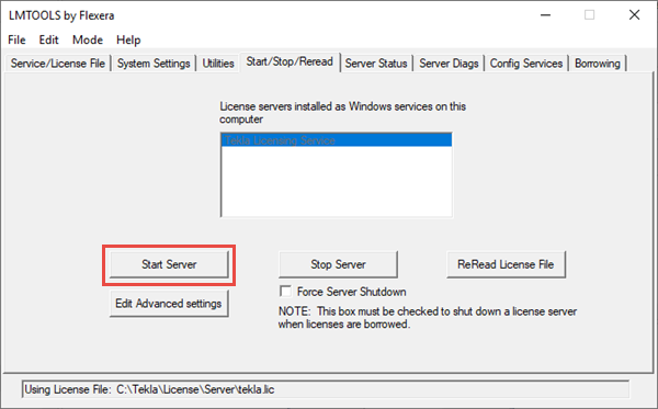Configurare il server licenze Tekla manualmente, quindi riavviare Tekla Licensing Service per rendere effettive le modifiche.
