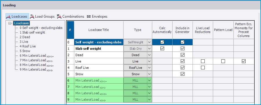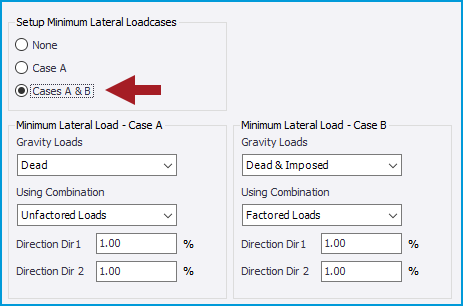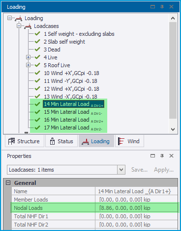 • Load Cases - when Case A or Cases A & B are enabled, the appropriate “Min Lateral Load” load cases are automatically created and listed in the Loading dialog as shown below. These can be manually included in combinations or via the Combination Generator in a similar manner to Notional/ Equivalent Horizontal Loads (NL/EHL).