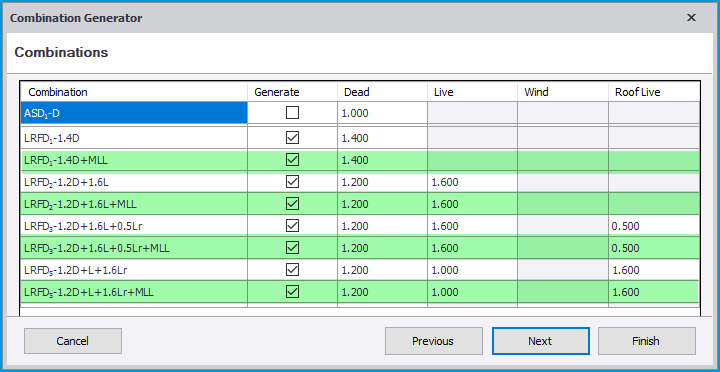 • Load Combinations - When the MLL Model Setting option is enabled, additional “+MLL” combinations are included for all Gravity combinations listed on the second page of the Combination Generator as shown in the picture below. You can then select which of these you wish to include.