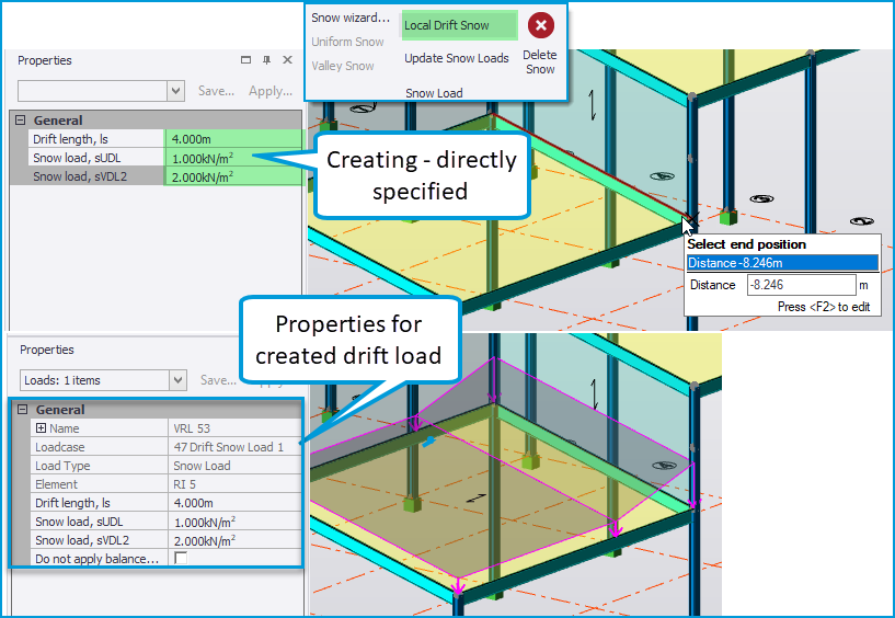 • Application of snow loads in the generated snow load cases is not automatic. However the snow wizard load functions of Uniform Snow, Valley Snow and Local Drift Snow can be used to quickly and easily apply these types of load to Roof panels. These work in a broadly similar manner to the previously supported regional codes, the main difference being that the load values - such as maximum load values and drift length etc - are specified directly.