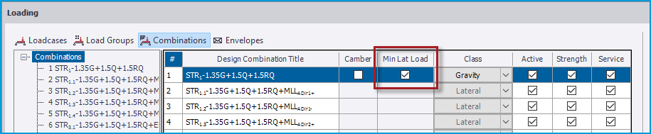 • The combination used for the MLL is set via a checkbox in the combinations main list in a new column headed “Min Lat Load” next to the existing “Camber” column, as shown in the picture below. Only Gravity Class combinations will be available for selection in this column. You can make the selection of the MLL combination via the Combination Generator as described above, or manually via this checkbox.