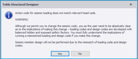 • In all cases the validity of setting a mismatched regional code and Seismic Code is at the discretion of and the responsibility of the engineer. The warning shown below is always issued when this is the case.
