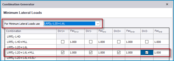 • As you proceed through the Combination Generator, a new MLL page is now displayed - after the Generator’s NL/EHL page - as shown in the picture below. On this page you specify 1) in the drop list at the top the combination to be used for the MLLs and 2) in the table of combinations the applied load direction(s) for each active MLL combination.