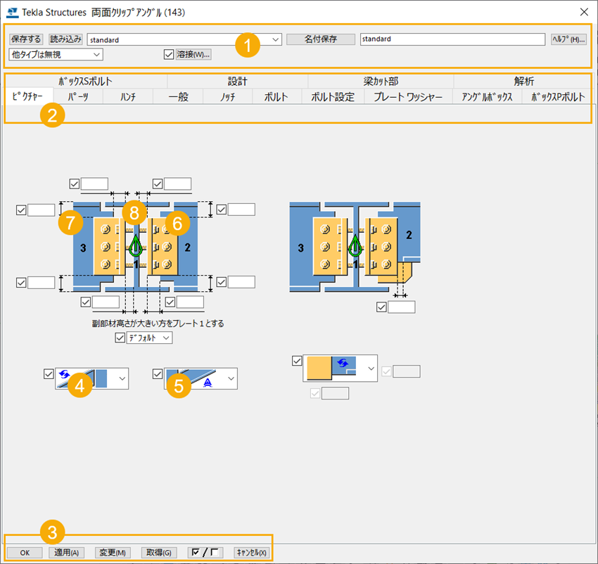 ダイアログ ボックスの上の部分では、定義済みの設定の保存と読み込みを行うことができます。一部のコンポーネントには、ボルト、溶接、および DSTV プロパティにアクセスするためのボタンがあります。 ジョイントおよびディテールを変更する際に、Tekla Structures により、タイプの異なるジョイントおよびディテールを無視するか、タイプに関係なく選択したすべてのジョイントおよびディテールを変更するかを選択することができます。変更する場合は、選択したコンポーネントのタイプが現在変更しているコンポーネントのタイプに変更されます。 詳細については、「オブジェクト プロパティの保存および読み込み」および「モデル フォルダー ファイルとファイル名拡張子」を参照してください。 |