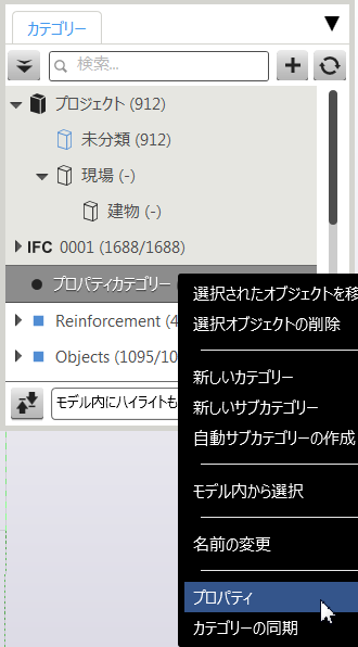 プロパティはカテゴリーにあるオブジェクトに追加されます。モデル内のオブジェクトを選択してカテゴリーに挿入するか、オブジェクトをカテゴリーに自動的に挿入するルールを定義することにより、カテゴリーの内容を手動で追加できます。