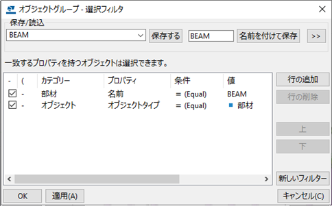 [行の追加] をクリックし、以下の図のように梁の選択フィルターを追加して、DRAWING_BEAM という名前で保存します。