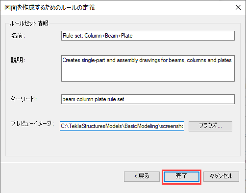 ルール セットに名前 (ルール セット: 柱+梁+プレート)、説明、キーワードを設定します。