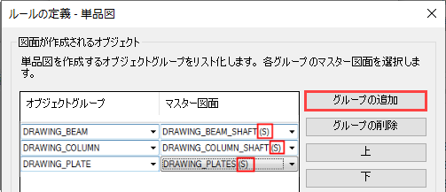 同様に、柱およびプレートの選択フィルターを作成し、DRAWING_COLUMN および DRAWING_PLATE という名前で保存します。